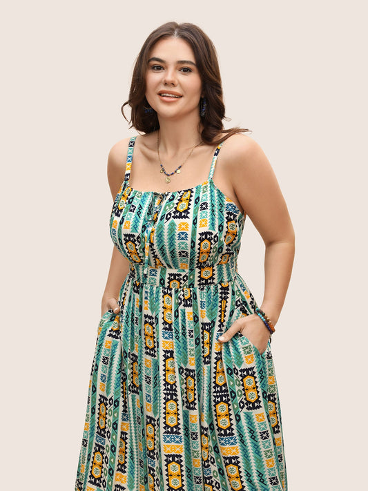 Boho Print Ruffle Sleeve Belted Midi Dress