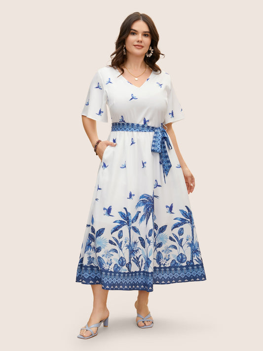 V Neck Tropical Print Ruffle Sleeve Maxi Dress
