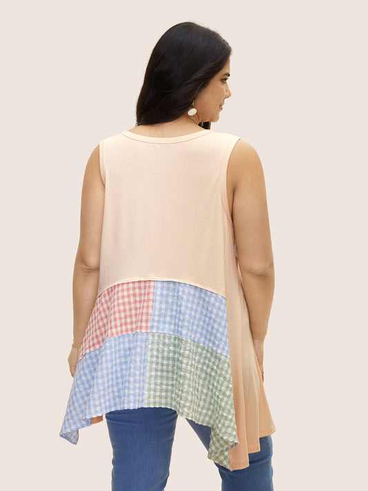 Notched Collar Gingham Contrast Patchwork Tank Top