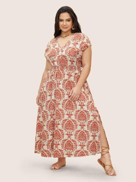 Moroccan Print Shirred Slit Hem Dress