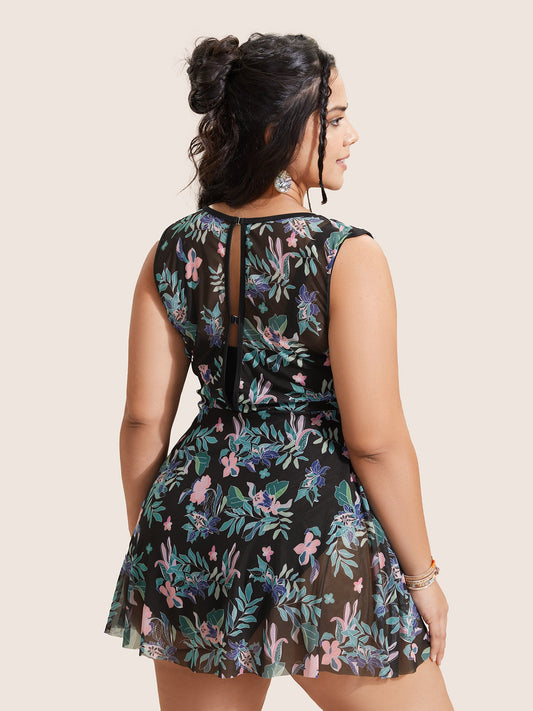 U Neck Tropical Print See Through Swim Dress
