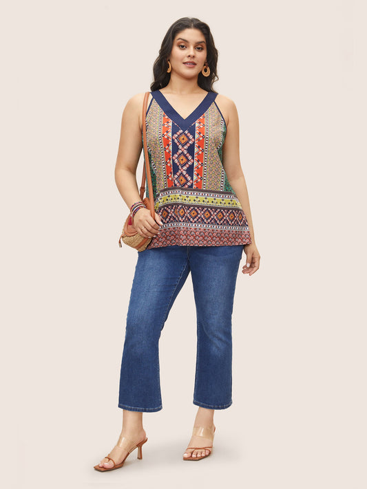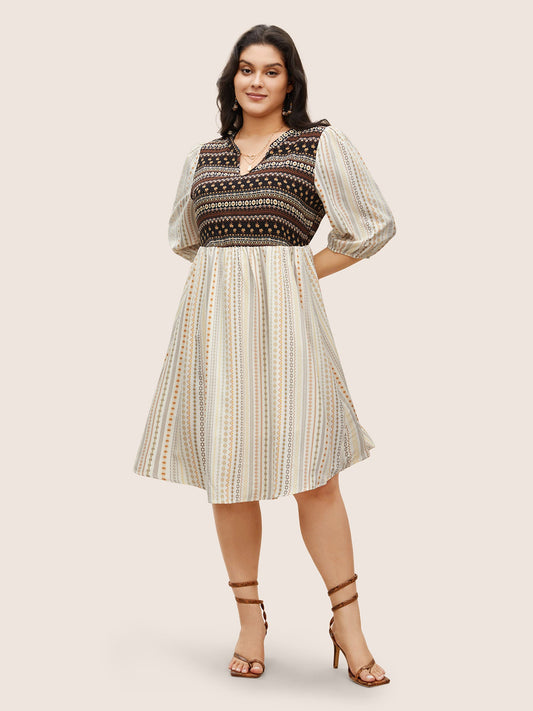 Bandana Striped Patchwork Notched Lantern Sleeve Dress