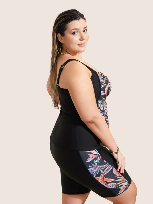 Tropical Print Patchwork Crossover Gathered Swim Top
