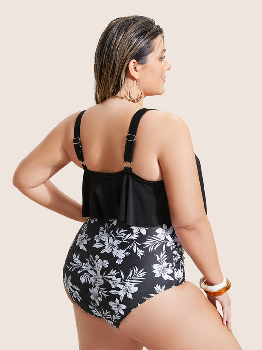 Floral Patchwork Tiered Ruffles One Piece Swimsuit