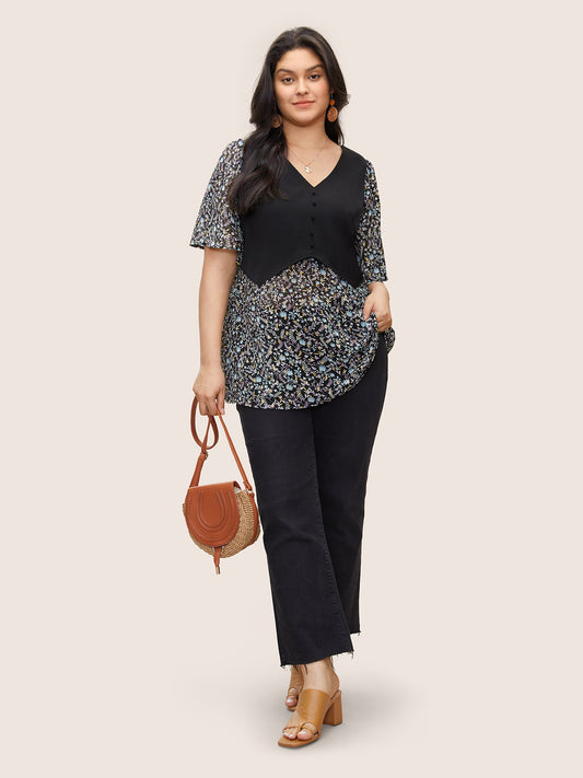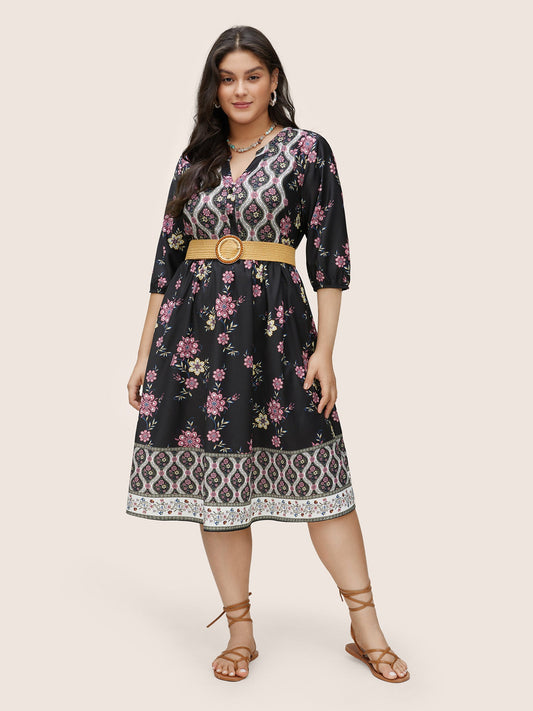Boho Print Patchwork Notched Lantern Sleeve Dress