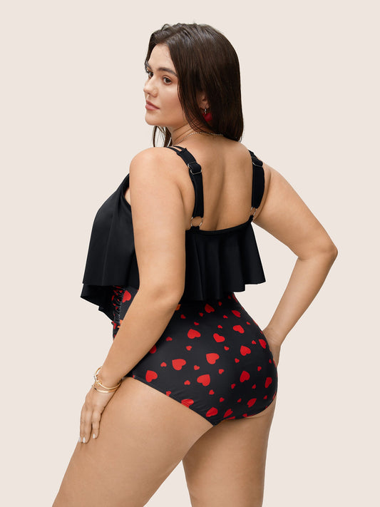 Heart Print Ruffle Layered Ruched One Piece Swimsuit