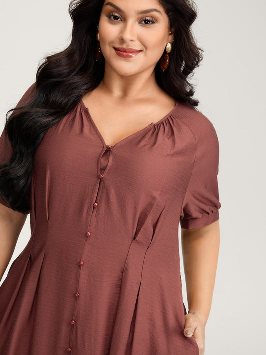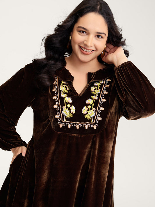 Velvet Floral Embroidered Neckline Knee-Length Dress