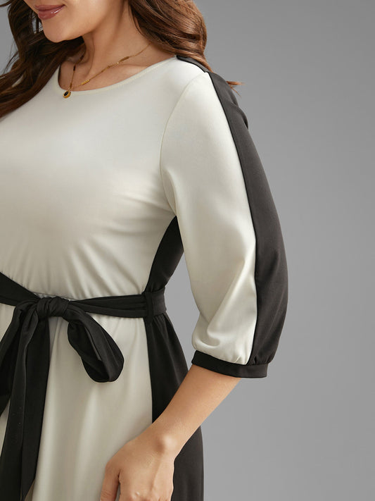 Contrast Patchwork Lantern Sleeve Belted Dress