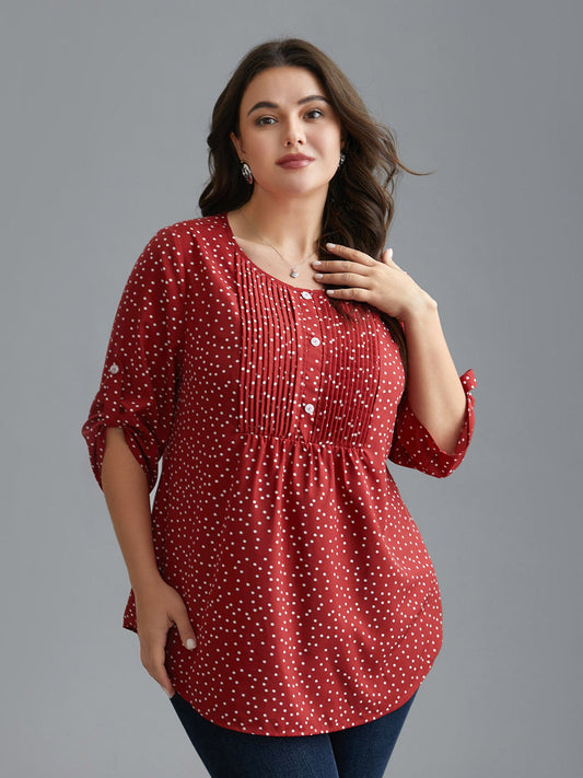 Pleated Polka Dot Button Cuff Sleeve Blouse