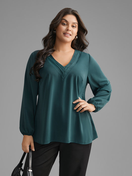 V Neck Pleated Lantern Sleeve Blouse