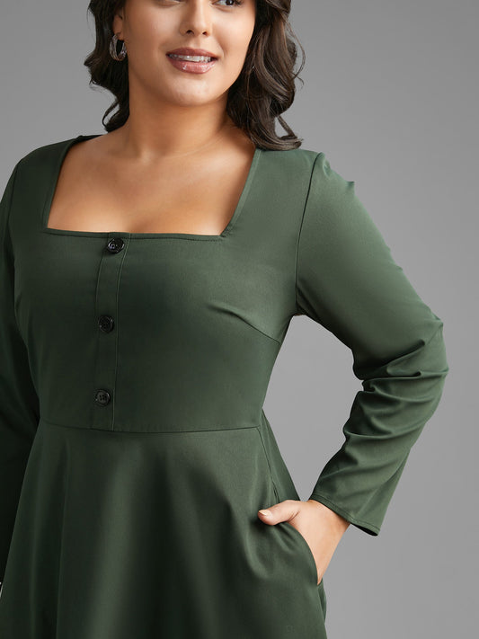 Square Neck Plain Button Detail Dress