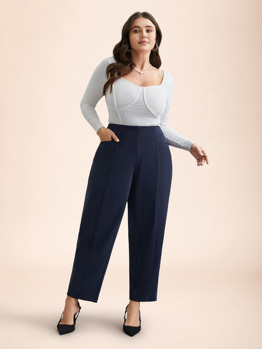 Stretchy-Waist Seamed Plicated Detail Pants
