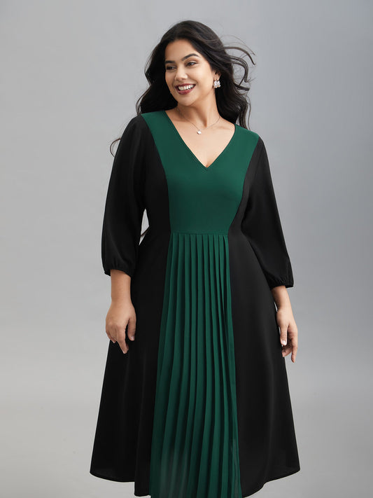 Color Block V-Neck Pleated Midi Dress