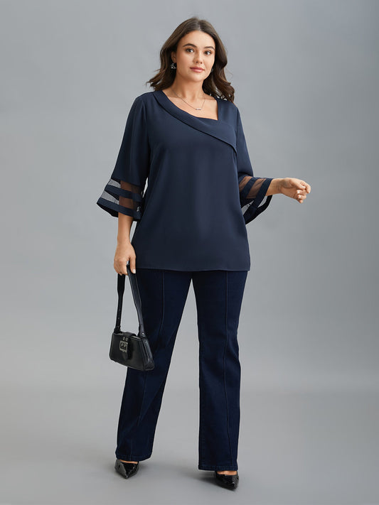 Sheer Sleeve Patchwork Asymmetrical Neckline Blouse