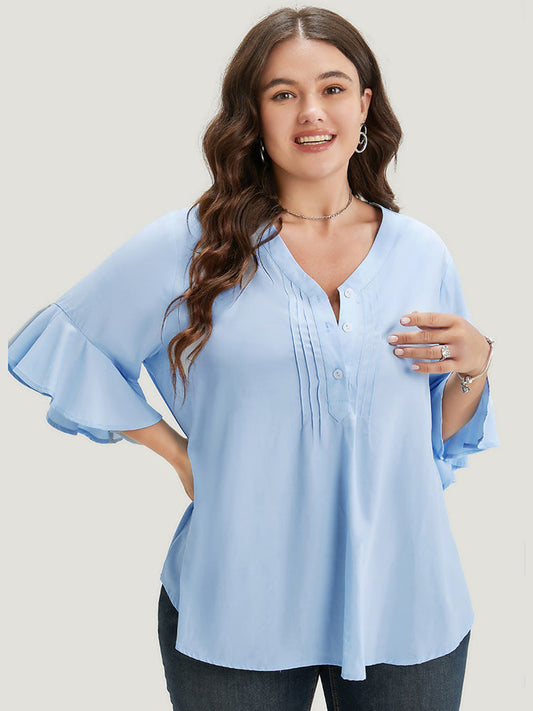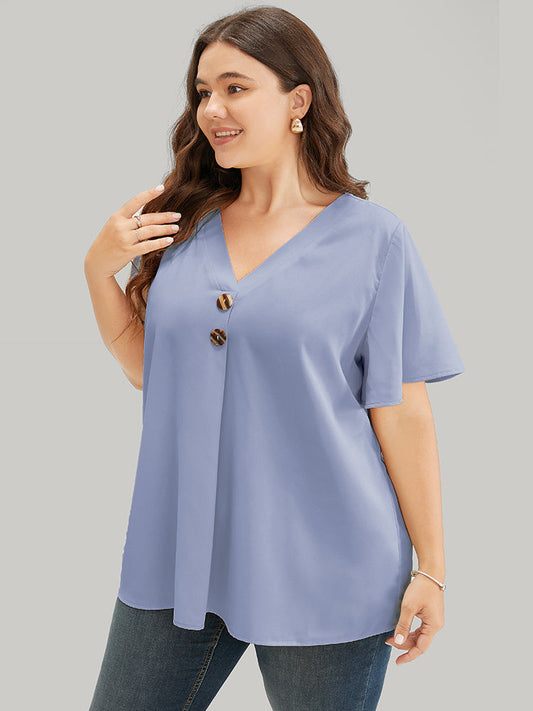 Solid Flutter Sleeve Button Detail Pleated V Neck Blouse