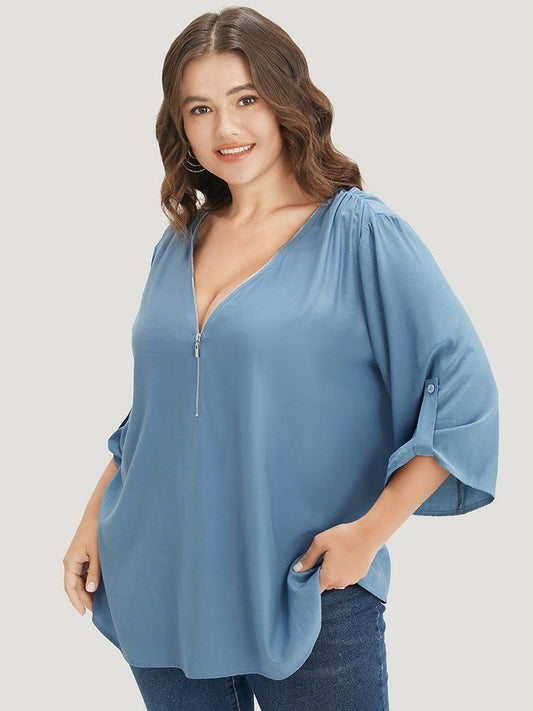 Solid Zipper Half Gathered Cuffed Sleeve Blouse