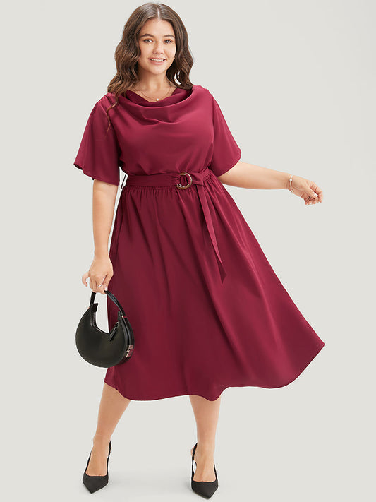 Plain Cowl Neck Pocket Buckle Belt Ruffle Sleeve Dress