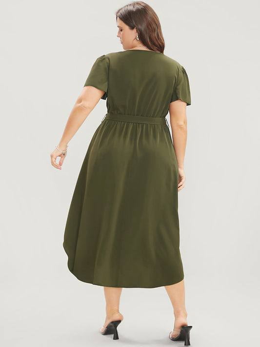 Solid Surplice Neck Pocket Ruffle Trim Dress