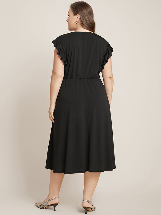 Solid Ruffle Trim Lace Insert Pocket Midi Dress