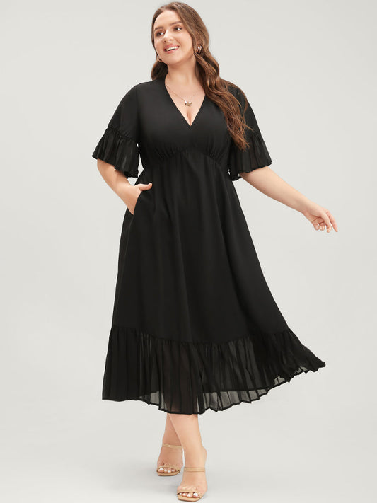 Solid V Neck Ruffles Pocket Mesh Pleated Hem Dress