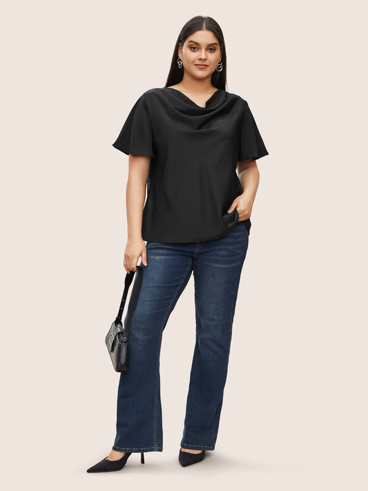 Plain Cowl Neck Ruffle Sleeve Blouse