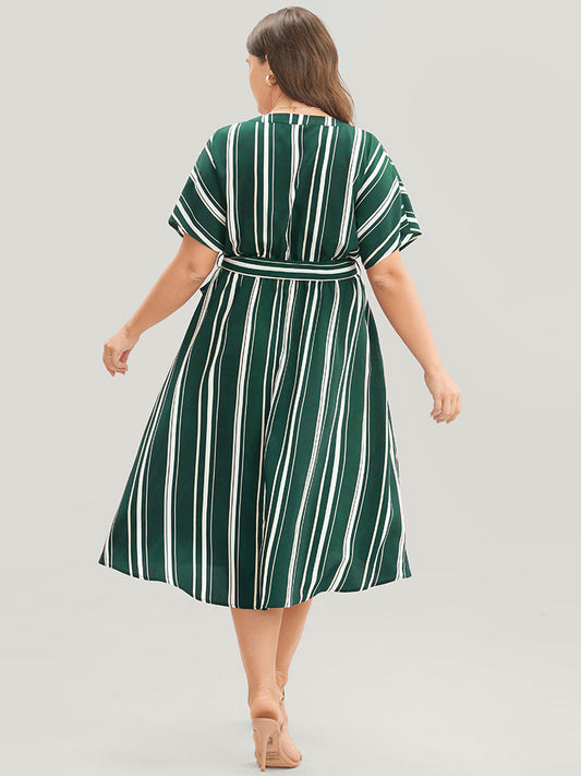 Striped Contrast V Neck Dolman Sleeve Pocket Belted Midi Dress