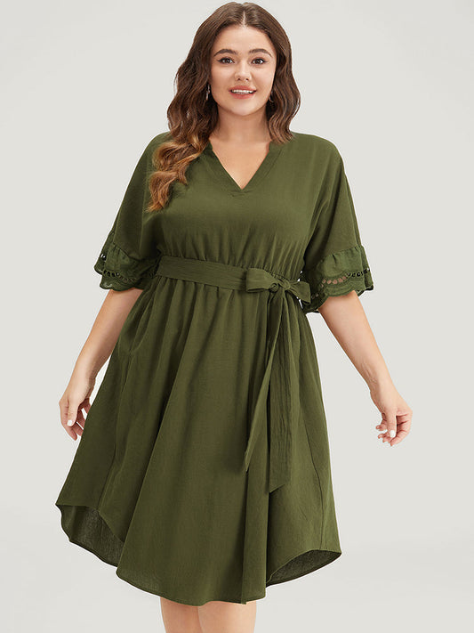 Solid Broderie Anglaise Pocket Belted Dolman Sleeve Arc Hem Dress