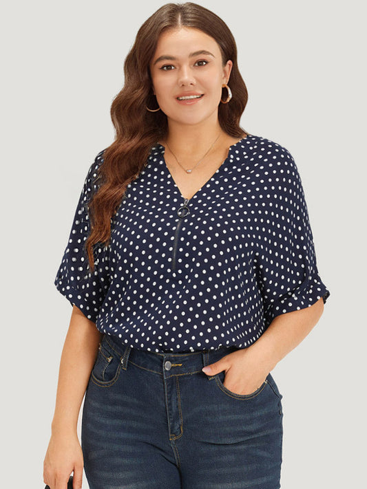 Polka Dot Zipper Notched Dolman Sleeve Blouse