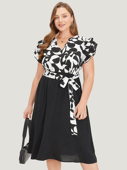 Geometric Pocket Belted Ruffle Sleeve Notched Dress
