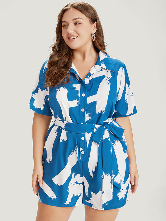 Brush Print Pocket Shirt Collar Button Up Belted Romper