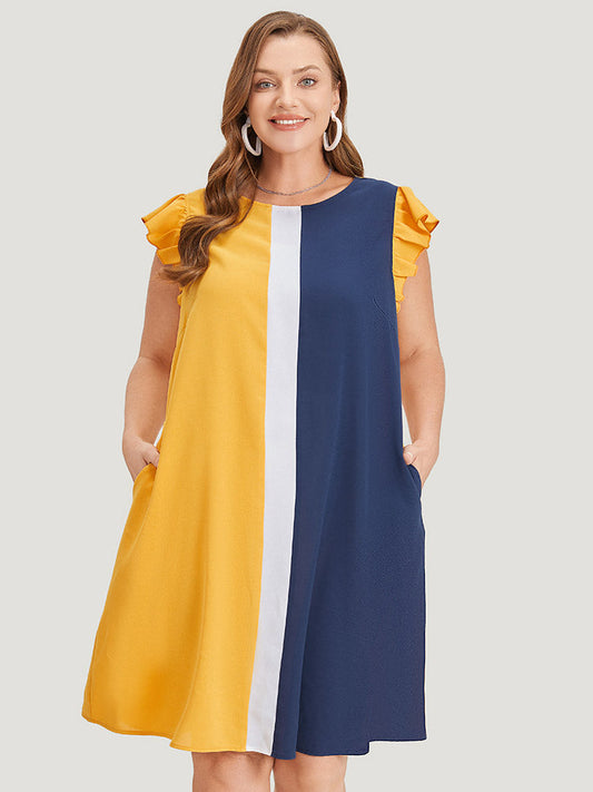 Contrast Patchwork Pocket Ruffle Cap Sleeve Dress