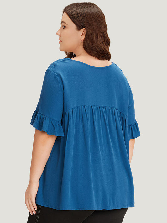 Solid Flutter Trim Pleated Button Detail Blouse
