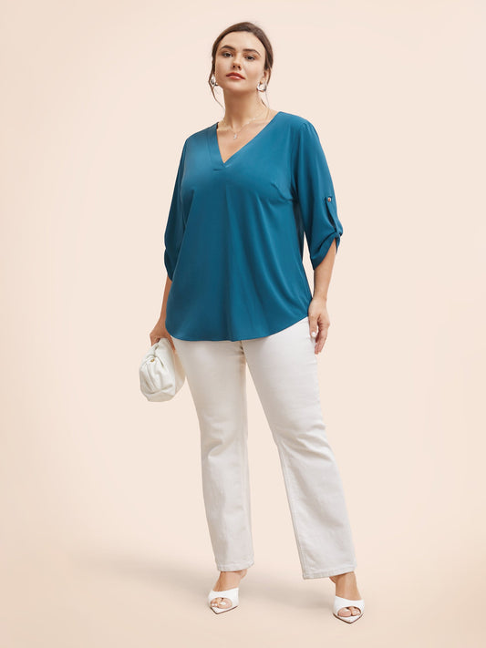 Solid Cuffed Sleeve Gathered Curved Hem Blouse