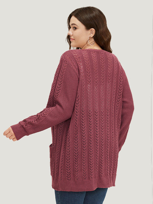Solid Patched Pocket Geo Eyelet Open Front Cardigan