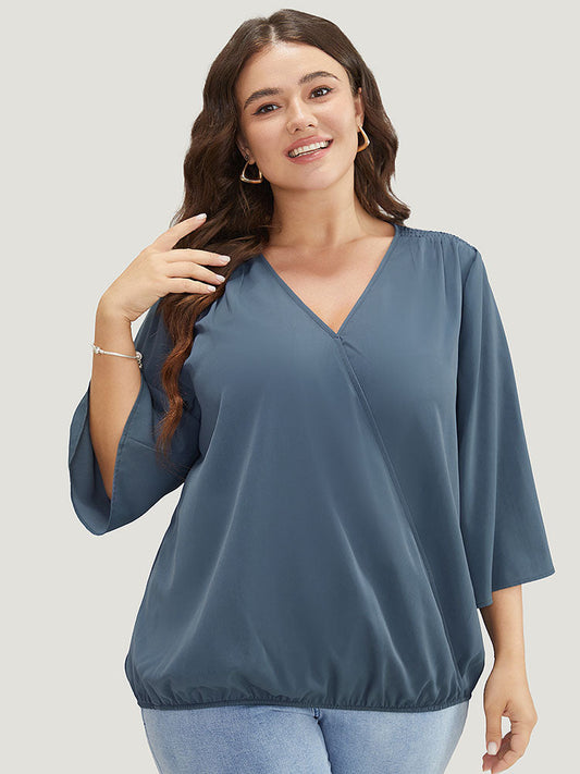Solid Shirred Gathered Flounce Sleeve Wrap Blouse