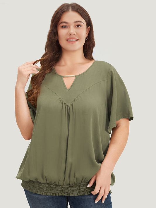 Solid Shirred Keyhole Gathered Ruffle Sleeve Blouse