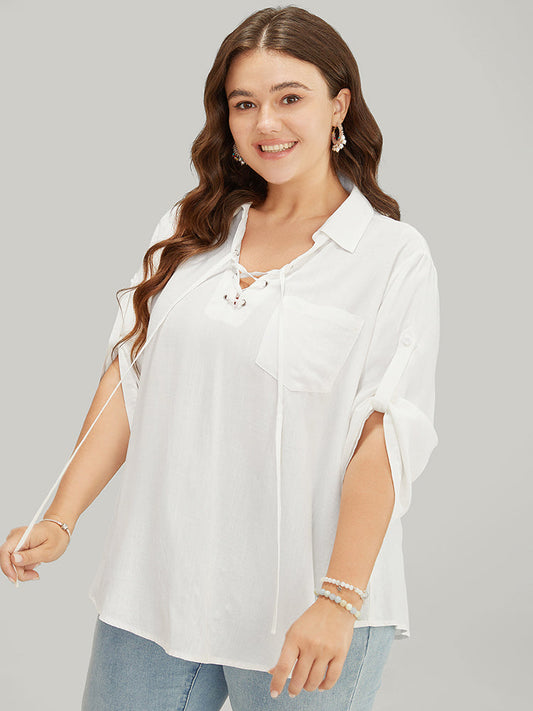 Solid Lace Up Pocket Cuffed Sleeve Blouse