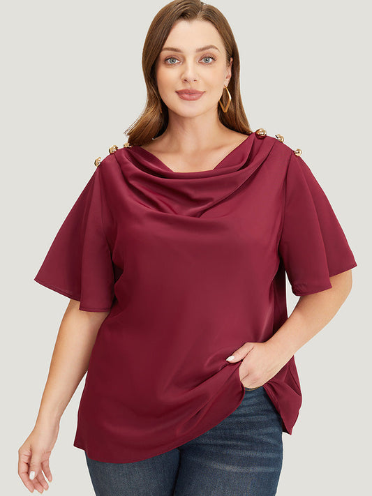 Plain Cowl Neck Button Detail Flutter Sleeve Blouse