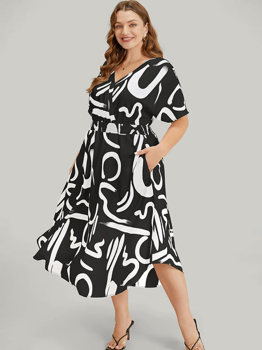 Geometric Print Pocket Dolman Sleeve Shirred Wrap Dress
