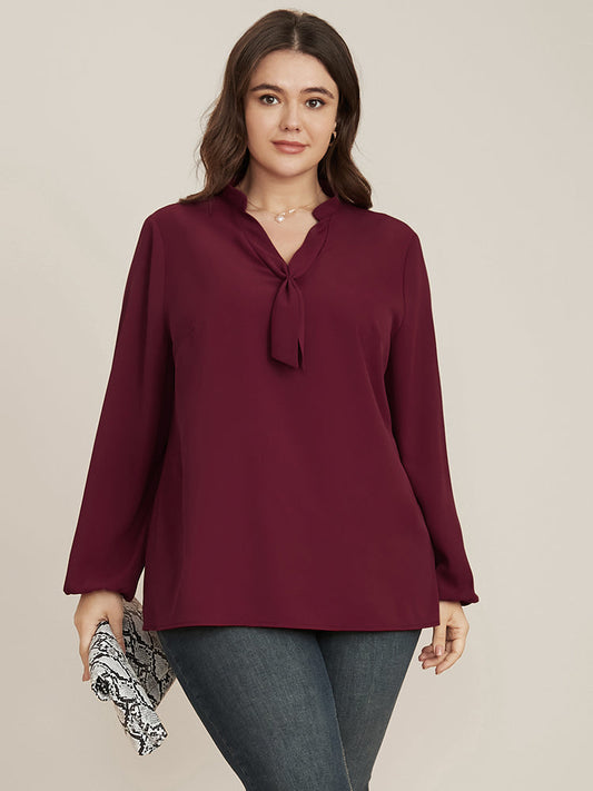 Solid Gathered Lantern Sleeve V Neck Blouse