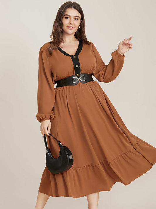 Solid Contrast Lantern Sleeve Button Detail Ruffle Hem Dress