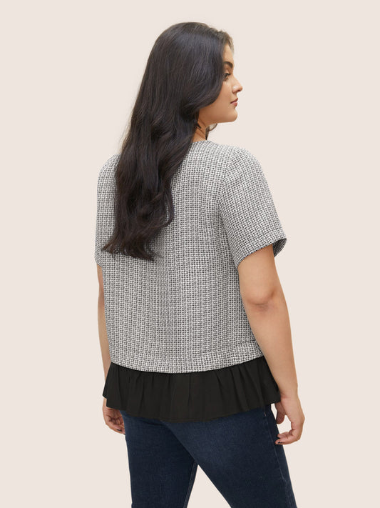 Tweed Patchwork Ruffle Hem Blouse