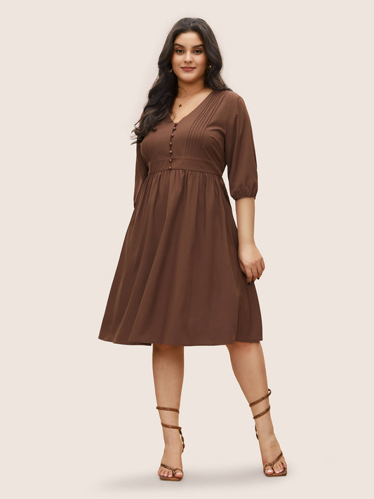 Solid Pleated Button Detail Lantern Sleeve Dress