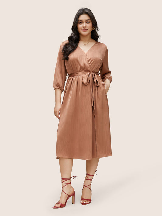 Textured Split Side Belted Overlap Collar Dress