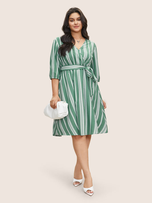 Striped Elastic Waist Belted Wrap Dress