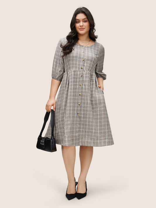 Plaid Button Detail Pocket Lantern Sleeve Dress