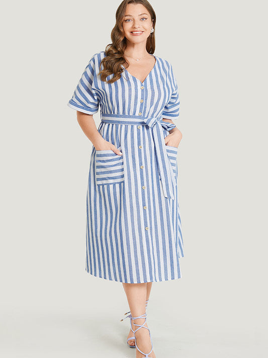 Striped Print Pocket Belted Button Detail Batwing Sleeve Dress