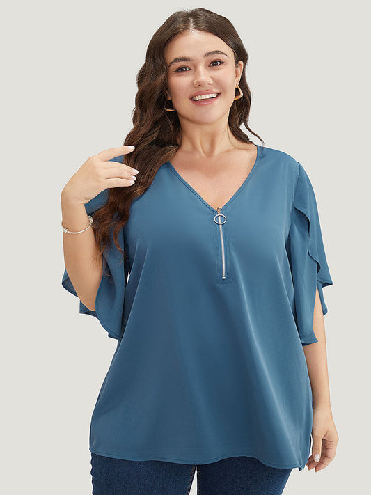 Solid Half Zipper Split Petal Sleeve Blouse