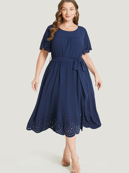 Solid Gathered Laser Cut Belted Pocket Ruffle Scalloped Trim Dress