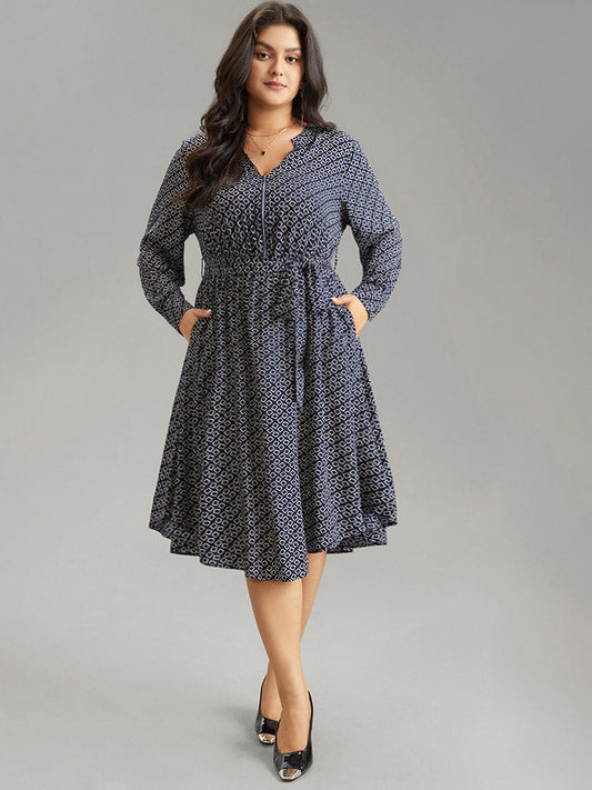 Geometric Graphic Notched Zipper Bowknot Dress